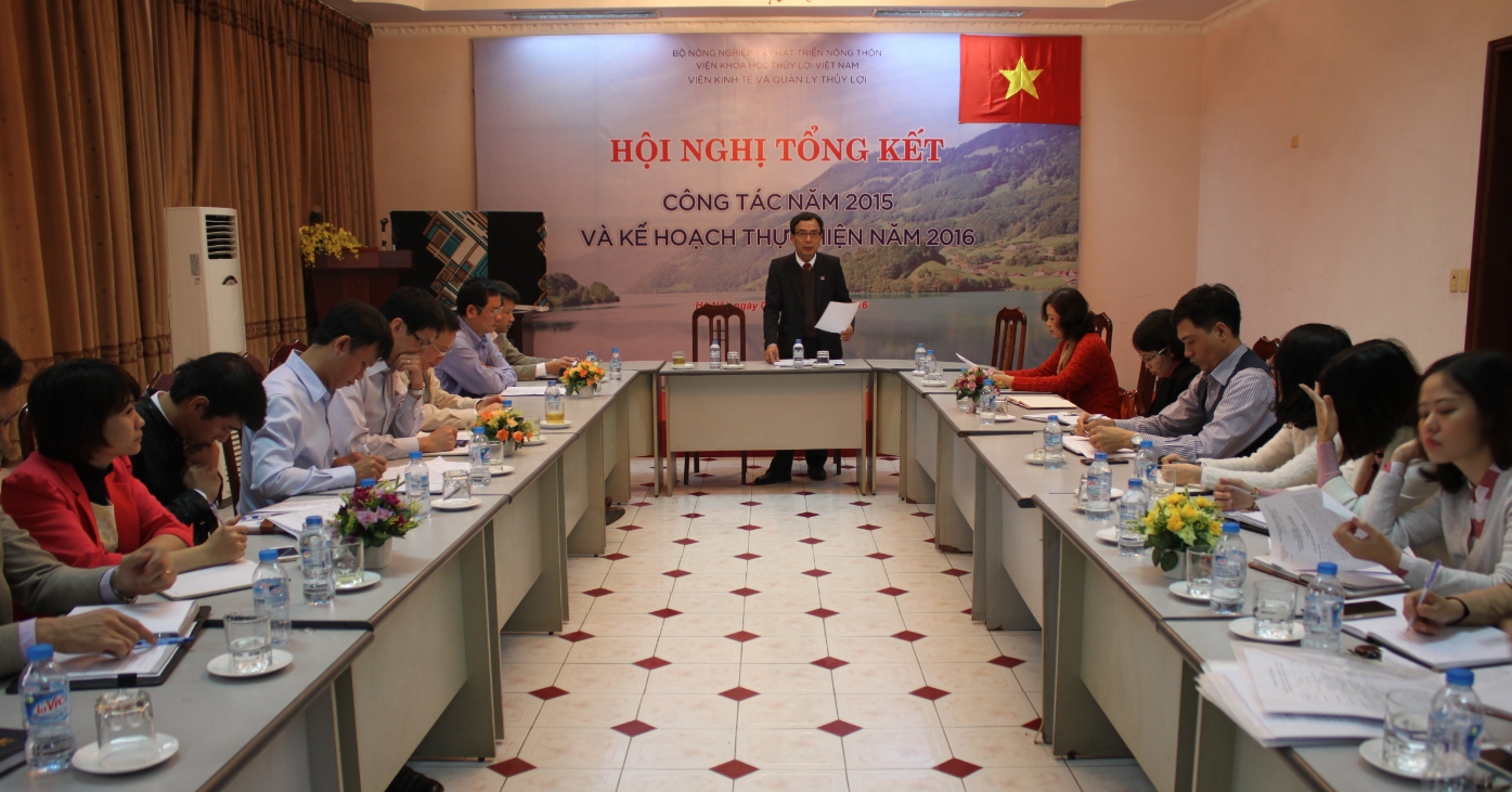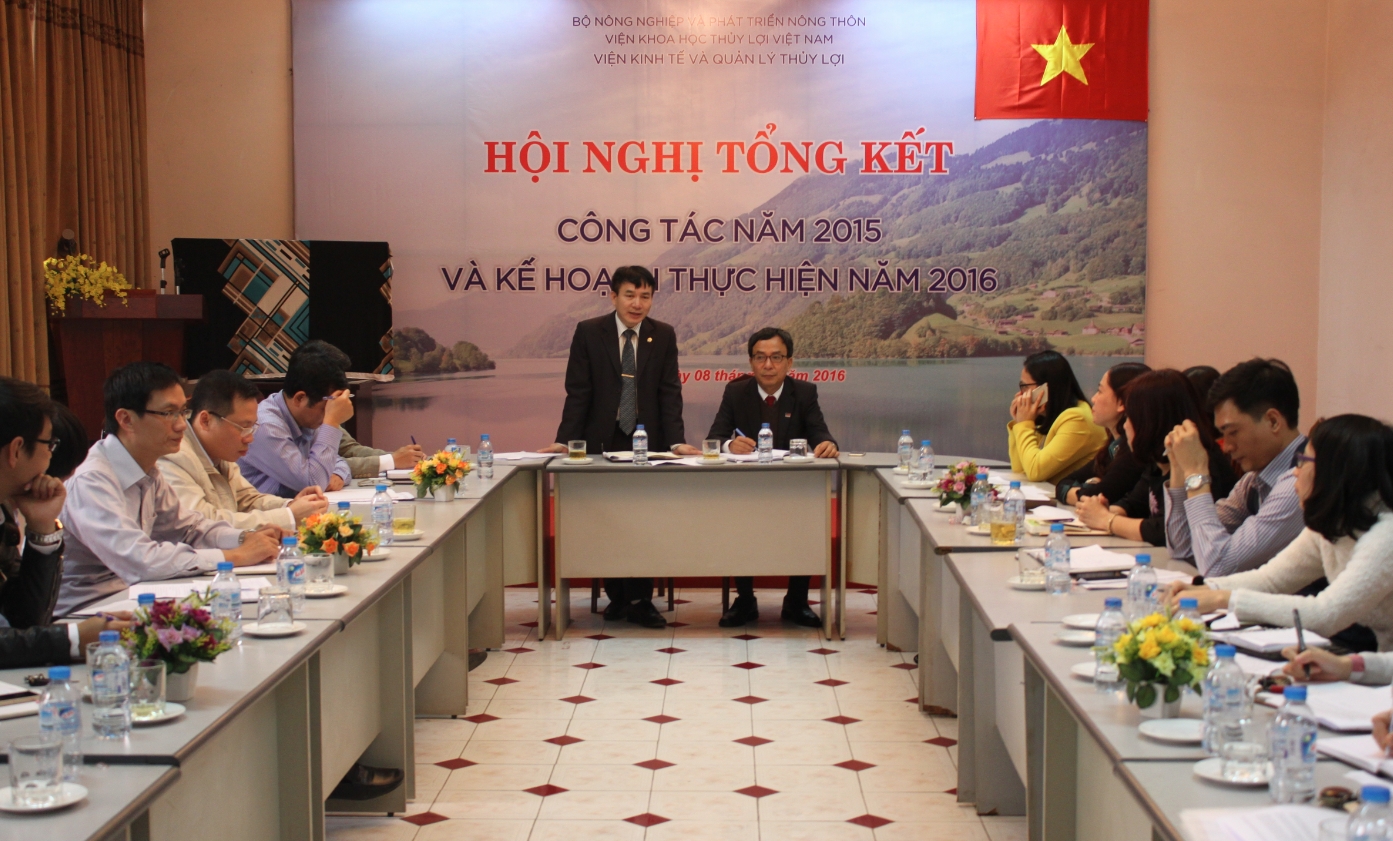 Phát biểu tại Hội nghị, đại diện Ban giám đốc Viện KHTLVN, GS Trần Đình Hòa chúc mừng và đánh giá cao các kết quả của Viện Kinh tế và Quản lý Thủy lợi. Đặc biệt, GS Trần Đình Hòa đánh giá cao Viện Kinh tế là ở kết quả các nghiên cứu kịp thời tham mưu trong xây dựng cơ chế chính sách quản lý ngành. Tuy vậy, Giáo sư cũng gợi ý với Viện về một số khía cạnh như chưa làm nổi bật lên các giá trị của Viện; cần tăng cường phối hợp với các đơn vị trong viện KHTLVN để nâng cao sản lượng nghiên cứu chuyên môn. Về phương hướng nhiệm vụ xuất phát từ các kết quả tổng kết Bộ về nhiệm vụ rà soát và hoàn thiện chính sách là quan trọng, sẽ là cơ hội mới cho Viện trong năm 2016 và những năm tiếp theo. Cuối cùng vấn đề trang thiết bị và cơ sở vật chất còn khá khó khăn cần ưu tiên trong kế hoạch chung của Viện KHTLVN trong năm 2016.