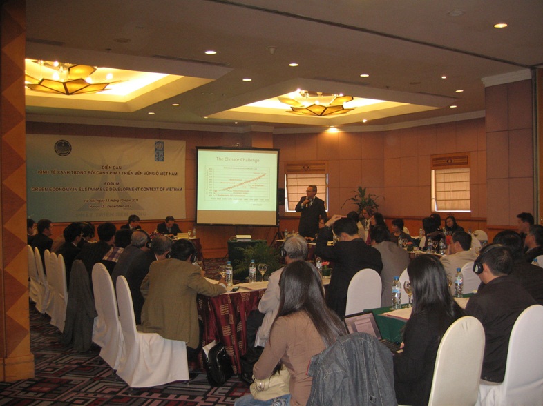 Tại Diễn đàn, các tham luận đã nêu ra quan điểm của các tổ chức quốc tế về kinh tế xanh và định hướng mục tiêu phát triển kinh tế xanh của các nước tiên phong trong quá trình phát triển xanh, như: UNEP đưa ra nhận định kinh tế xanh là sự lựa chọn tốt nhất cho sự phát triển bền vững của các quốc gia, vừa thúc đẩy tăng trưởng kinh tế ổn định, vừa làm dịu những căng thẳng của thiên nhiên, ngăn chặn chảy máu tài nguyên và tạo nên bùng nổ việc làm trong thế kỷ 21; theo OECD thì nền kinh tế xanh sẽ tạo động lực mới thúc đẩy tăng trưởng thông qua tăng cường hiệu quả sử dụng thiên nhiên, tạo điều kiện nghiên cứu các phát minh mới giúp xử lý các vấn đề môi trường, hình thành các thị trường và việc làm thông qua khuyến khích sử dụng công nghệ, sản phẩm và dịch vụ xanh, tăng cường tính ổn định vĩ mô do giảm biến động giá cả của cải tài nguyên, gia tăng nguồn thu ngân sách. Các nước phát triển trên thế giới thì ủng hộ phát triển xanh và coi đây là một trong những nội dung của tái cơ cấu kinh tế nhằm phục hồi kinh tế sau khủng hoảng và duy trì lợi thế canh tranh trong nền kinh tế thế giới và sử dụng kinh tế xanh như một công cụ để tạo lợi thế kinh tế quốc tế.